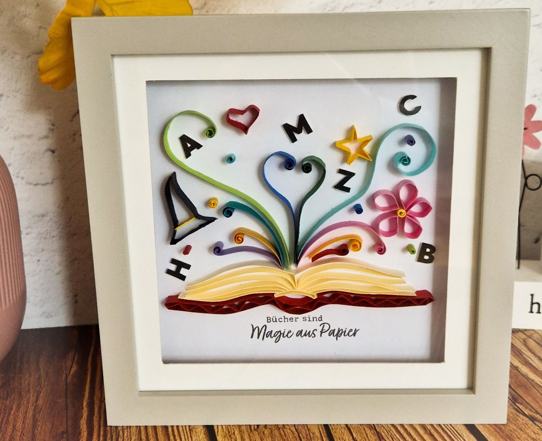 Was gibt es Schöneres, als entspannt auf dem Sofa oder am Strand zu sitzen und seine Nase in ein gutes Buch zu stecken? Eintauchen in fremde Welten und Geschichten, um Abstand vom stressigen Alltag zu bekommen. Es ist mittlerweile nachgewiesen, dass Lesen Stress lindert, zur Entspannung beiträgt und sogar die Lebenserwartung erhöhen kann. Tatsächlich gibt es sogar einen Tag, an dem wir Leseratten und Buchliebhaber unsere Leidenschaft feiern können, den "Tag der Buchliebhaber", der heute am 09.August gefeiert wird. Um meine Liebe zu Büchern zu zeigen, habe ich ein Quilling-Kunstwerk geschaffen. Der Spruch „Bücher sind Magie aus Papier“ (Stempel von Stampin´Up!) rundet das Ganze perfekt ab. Möchtest du auch zeigen, dass du ein echter Buchliebhaber bist und ein einzigartiges Kunstwerk an deiner Wand hängen haben? Dann melde dich gerne bei mir, und ich zaubere dir dein ganz persönliches Quilling-Bild!