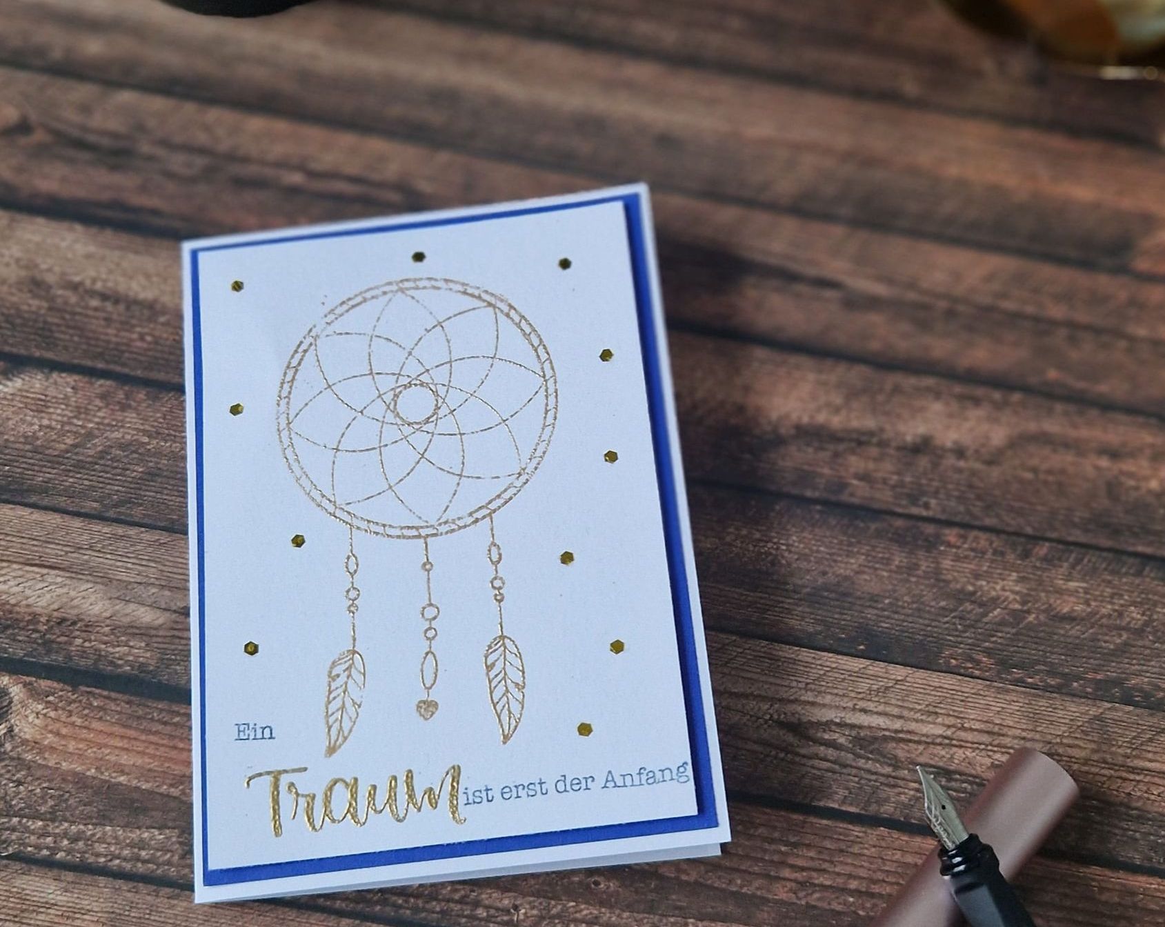 Es ist eine schlichte Karte geworden wo ich als Highlight den Dreamcatcher und das Wort Traum gold embosst habe.