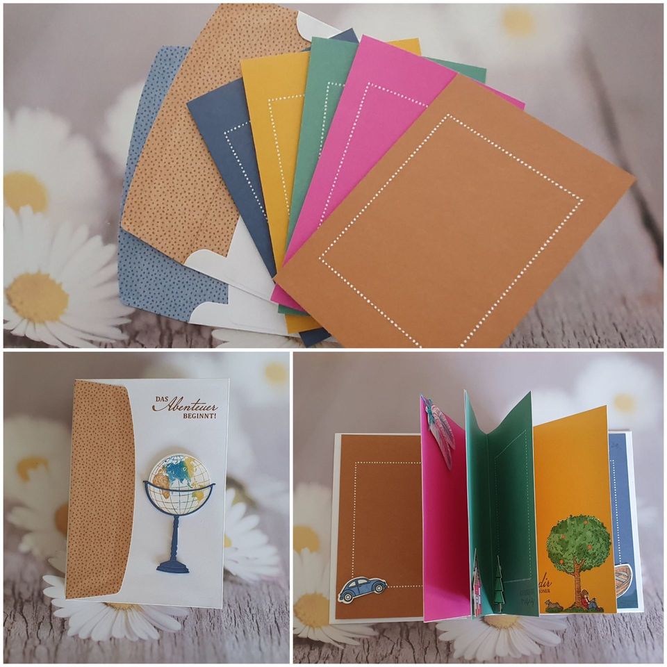 Die Umschläge dienen dabei als Hülle für das Album. Dafür habe ich die Laschen der Umschläge nach Außen geklebt so ensteht gleich schon ein farbiger Akzent. Die Karten, in den In Colors, sind der perfekte bunte Hintergrund für Fotos, deshalb habe ich die Karten mit den weißen Innenseiten aneinander geklebt. Jede Seite habe ich mit einem anderen Stempelset dekoriert. Die Set´s sind aus dem Hauptkatalog und dem neuen Herbst- / Winterkatalog.