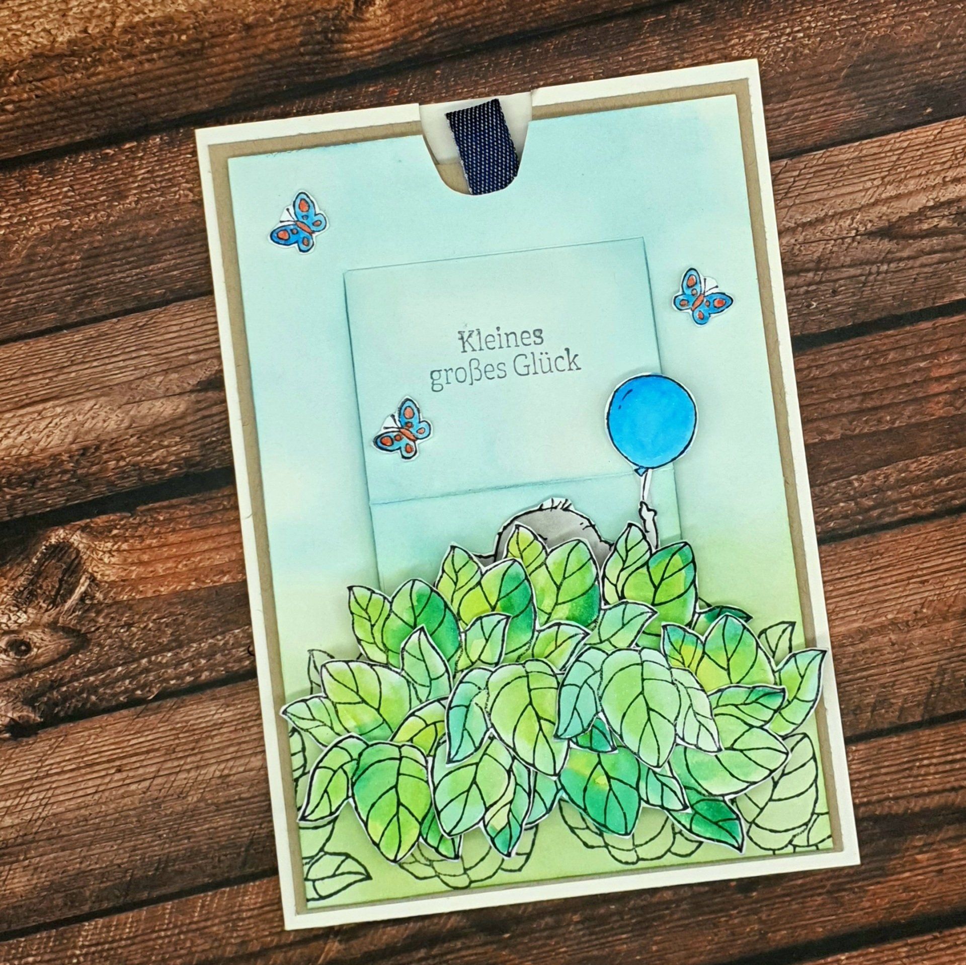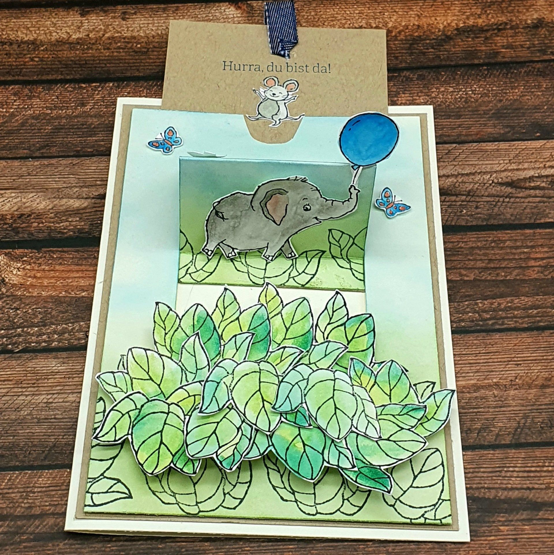 Ich wusste sofort das sich bei mir der kleine süße Elefant irgendwie verstecken und als Überraschung sichtbar werden sollte. So ist diese Ziehkarte entstanden. Die Motive habe ich auf Seidenglanz gestempelt und koloriert habe ich alles mit dem Wassertankpinsel und Stempelfarbe. Eine schöne Idee als Karte zur Geburt.