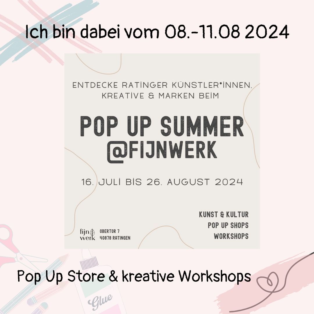 Das Fijnwerk in Ratingen veranstaltet einen Pop Up Summer und bietet den Workshopraum an für Kunst & Kultur, Pop Up Shops und Workshops. Ich darf dabei sein und bin vom 08.08.-11.08.2024 vor Ort. Ihr könnt bei mir meine kreativ gestalteten Produkte kaufen, kreative Arbeiten in Auftrag geben und selber kreativ werden, beim Make&Take (Gestalte deine eigene Grußkarte) oder bei einen meiner Workshops. Öffnungszeiten: 09.08. 10-18 Uhr Make & Take 10-13 & 15-18 Uhr (5€/Grußkarte) 10.08. 10-18 Uhr Make & Take 10-13 & 15-18 Uhr (5€/Grußkarte) 11.08. 11-17 Uhr Stamp´s meets Button - Make & Take (zusammen mit denkbuttisch) Workshops: 08.08. 19 Uhr "gemütlicher Herbst" Preis: 28€ Wir gestalten mit Stempel zwei Teegläser und einen Teelichthalter und basteln ein Tablett aus Holzklötzchen. 09.08. 19 Uhr "Quilling Bild" Preis: 32€ Bei der Quilling Technik werden aus Papierstreifen kunstvolle Objekte und Bilder gebastelt. Ihr habt verschiedene Motive zur Auswahl oder könnt eurer Kreativität freien lauf lassen. 10.08. 19 Uhr "Buchbinden" Preis: 38€ Wir gestalten mit Buchleinen und Designerpapier ein DIN A5 Buch, im Inneren mit leeren Seiten zum selber gestalten. Ihr habt verschiedene Farben an Buchleinen und Designerpapiere zur Auswahl. Du möchtest an einem der Workshop´s teilnehmen? Dann fülle das Kontaktfomular aus und schicke mir deine verbindliche Anmeldung. Ich schicke dir anschließend eine Anmeldbestätinung und die Rechnung. Wenn du diese bezahlt hast, ist dein Platz für den Workshop reserviert.